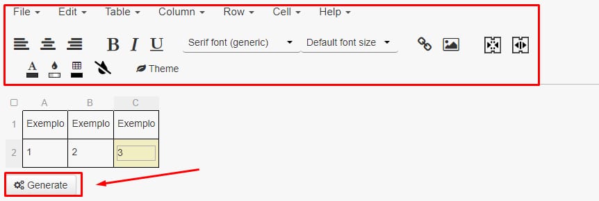 2. Use os botões do menu para criar e personalizar a tabela. Digite os valores dentro das células da tabela e clique em Generate [Gerar]: