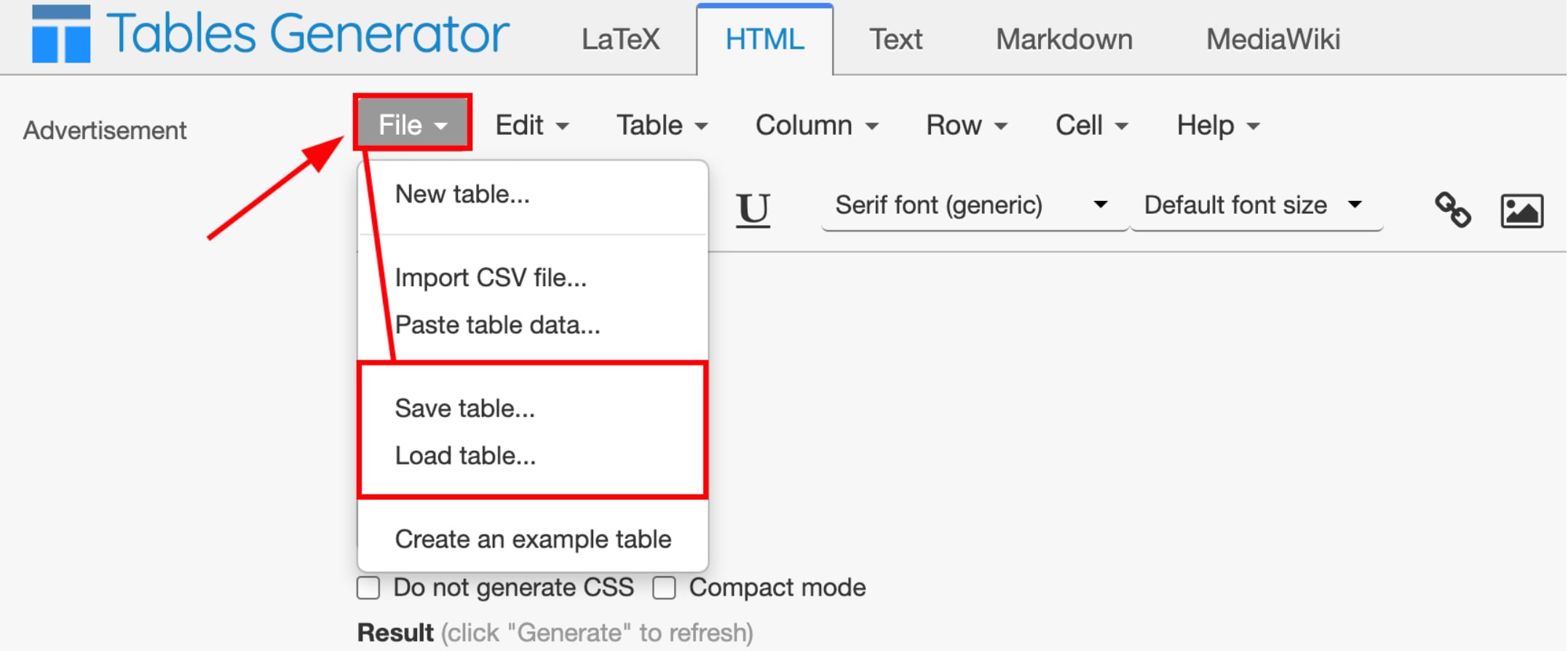 Você também pode usar a ferramenta Tables Generator para salvar as informações da sua tabela para usar no futuro (clique em Save table…). Para importar essas informações depois, clique no botão Load table…