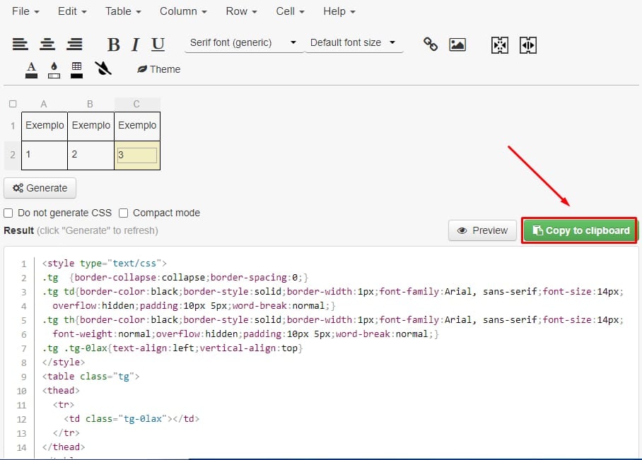 3. Com a tabela criada, clique em Copy to clipboard [Copiar para área de transferência] para copiar o código gerado pela ferramenta: