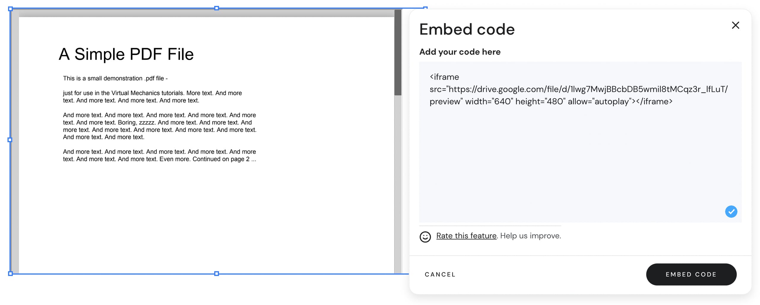 Você pode enviar seu arquivo em PDF para o Google Drive e incorporá-lo em seu site usando o elemento de código de incorporação.