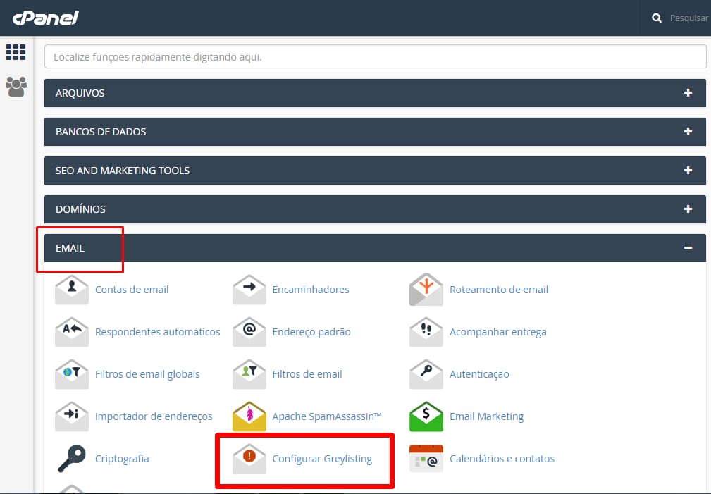 Basta fazer login no cPanel, ir até a seção E-mail e clicar em Configurar Greylisting: