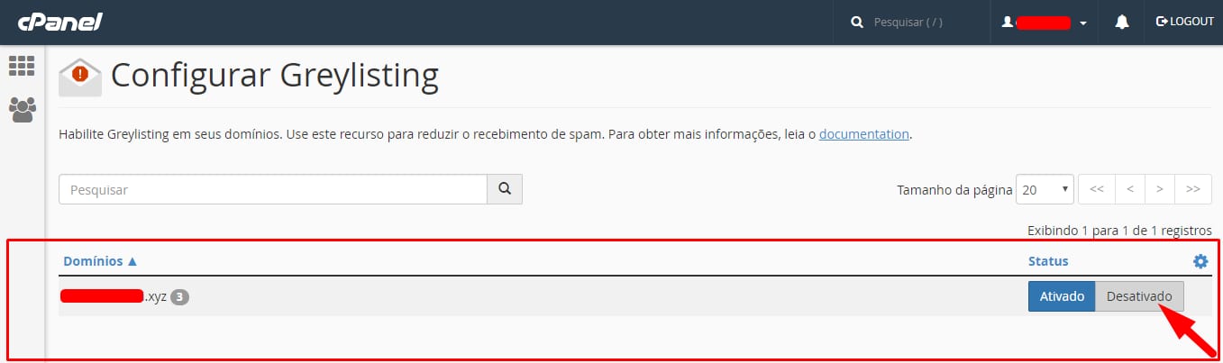 Selecione o domínio para o qual pretende desativar a greylisting, e clique em Desativado: