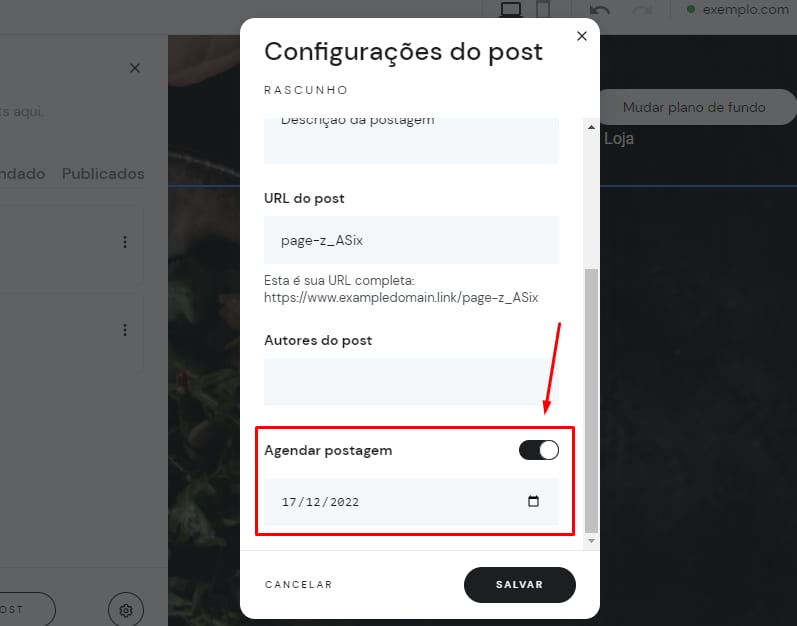 Na aba Geral, role para baixo até encontrar a seção Agendar postagem e clique no botão para habilitar o agendamento. Depois, escolha a data:
