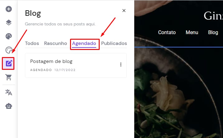 Para ver a lista de todos os posts agendados, vá até a aba Blog no menu lateral esquerdo e selecione a aba Agendado: