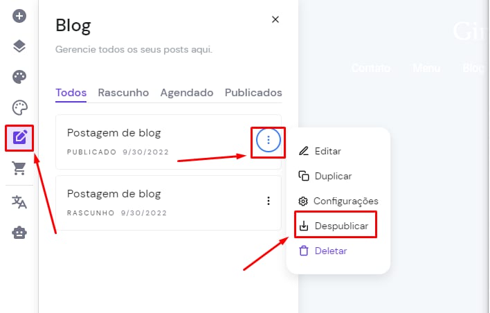 Dentro do editor de sites, vá até o menu lateral esquerdo e clique em Blog. Uma lista aparecerá com todas as postagens do seu blog. Ao lado do post que você deseja despublicar, clique no ícone de três pontinhos (⋮) e selecione Despublicar: