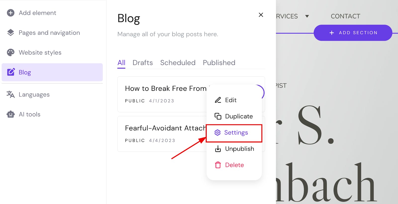 1. No editor, abra o painel de gerenciamento do blog à esquerda e procure pela postagem que você deseja atribuir a uma categoria específica. Clique nos três pontinhos ⋮ próximo ao título da postagem do blog: