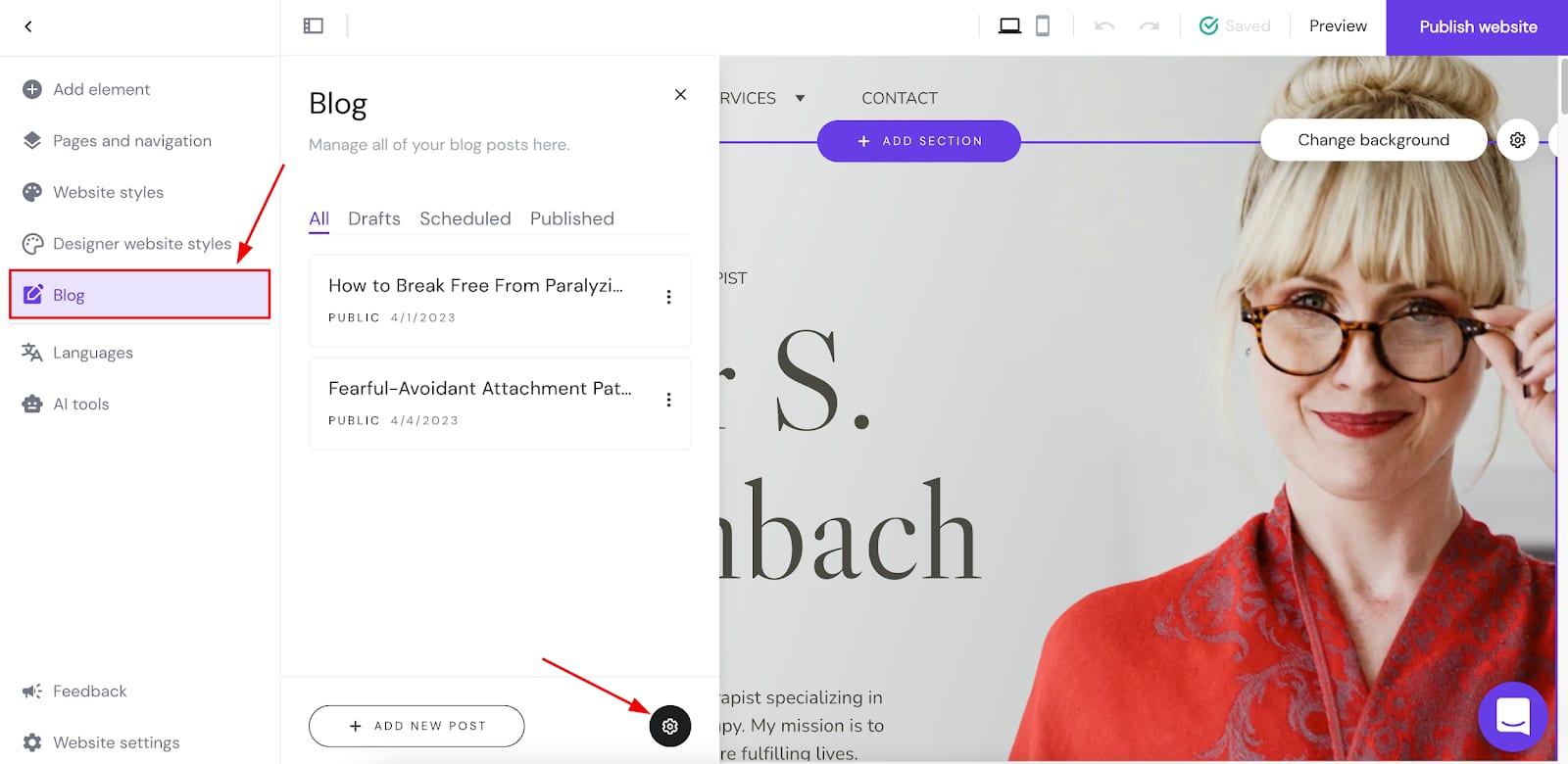 1. No editor, expanda o painel de gerenciamento do blog à esquerda e clique na engrenagem de configurações no canto inferior direito da ferramenta de blog.