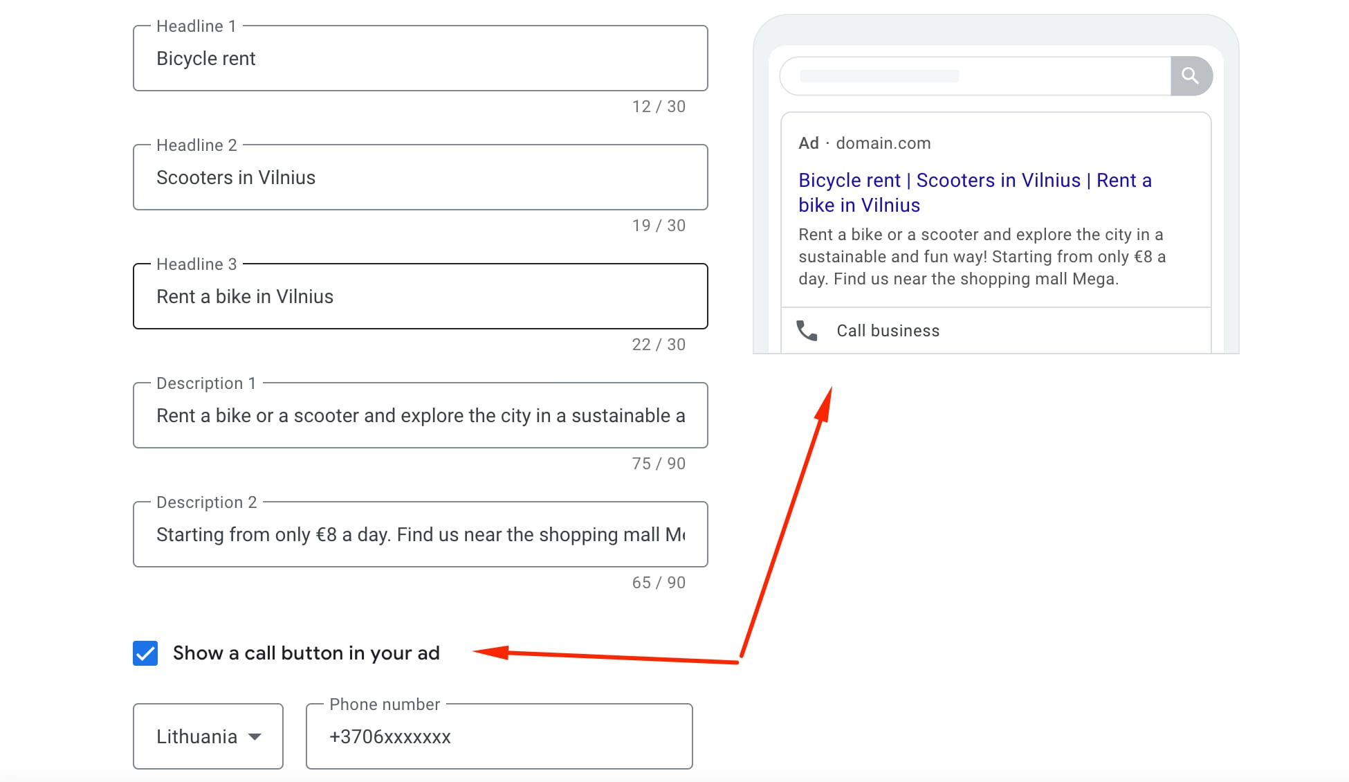 Insira três títulos e duas descrições. Os títulos devem ser curtos e chamativos, enquanto as descrições devem descrever seus produtos ou serviços com mais detalhes. Saiba mais: Como escrever um anúncio eficaz com o Google Ads (inglês)