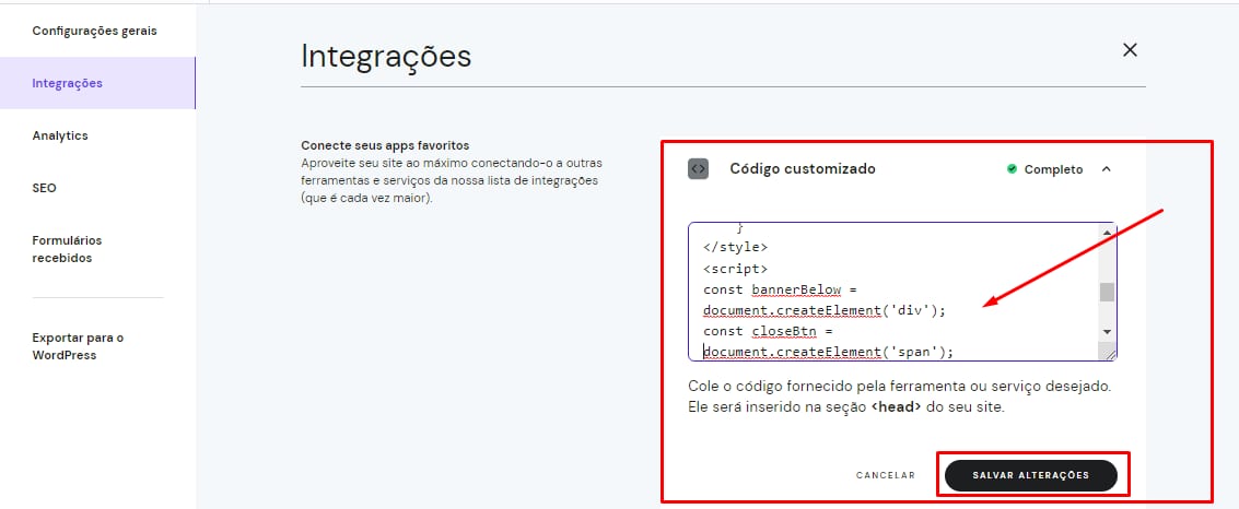 Vá até a área Código customizado, cole a tag HTML que você copiou, e clique em Salvar alterações. Depois, atualize seu site.