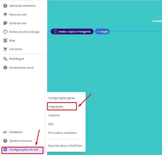 4. Entre no Criador de Sites da Hostinger e abra as Configurações de integrações: