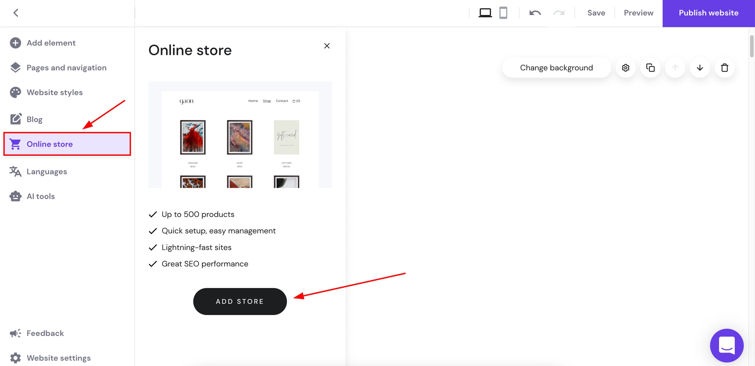 Para habilitar a loja online em seu site, abra o construtor, expanda o painel de Loja online à esquerda e clique em Adicionar loja:
