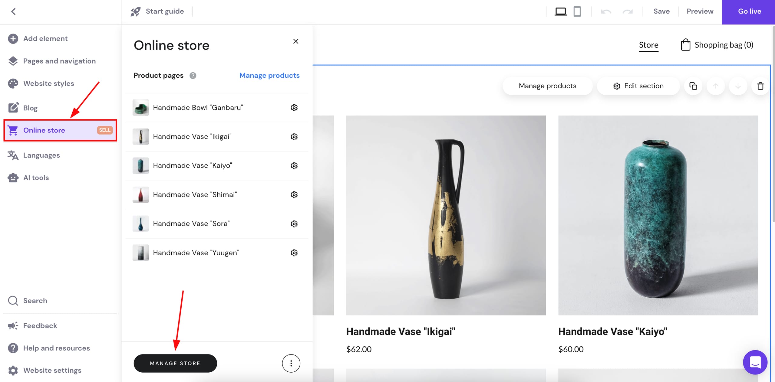 Dessa forma, uma seção de loja de amostra será inserida em sua página – você pode personalizá-la posteriormente. Agora, novamente, expanda o painel Loja online à esquerda e clique em Gerenciar loja: