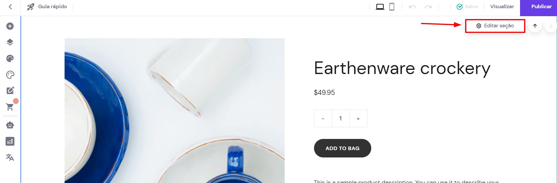 Aqui, você pode personalizar as seguintes áreas da seção de produto: