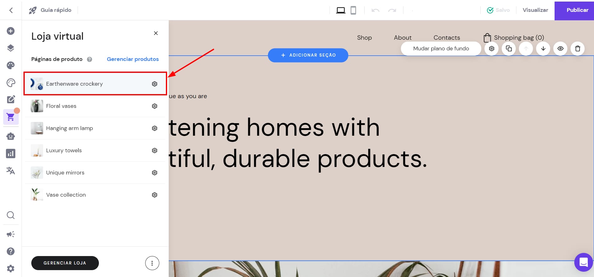 Para encontrar todas as suas páginas de produto, basta acessar o criador de sites e expandir o painel Loja virtual à esquerda: