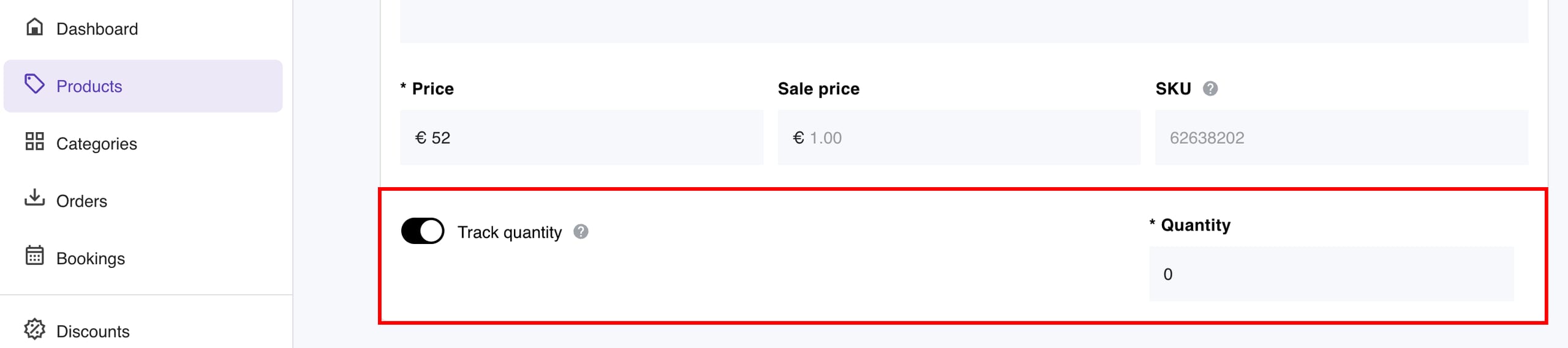 Na área de gestão da sua loja, aceda a Produtos e clique num produto que pretende editar. Nas configurações do produto, role um pouco para baixo e alterne o botão Rastrear quantidade para habilitar o rastreamento de estoque. Em seguida, especifique a quantidade em estoque: