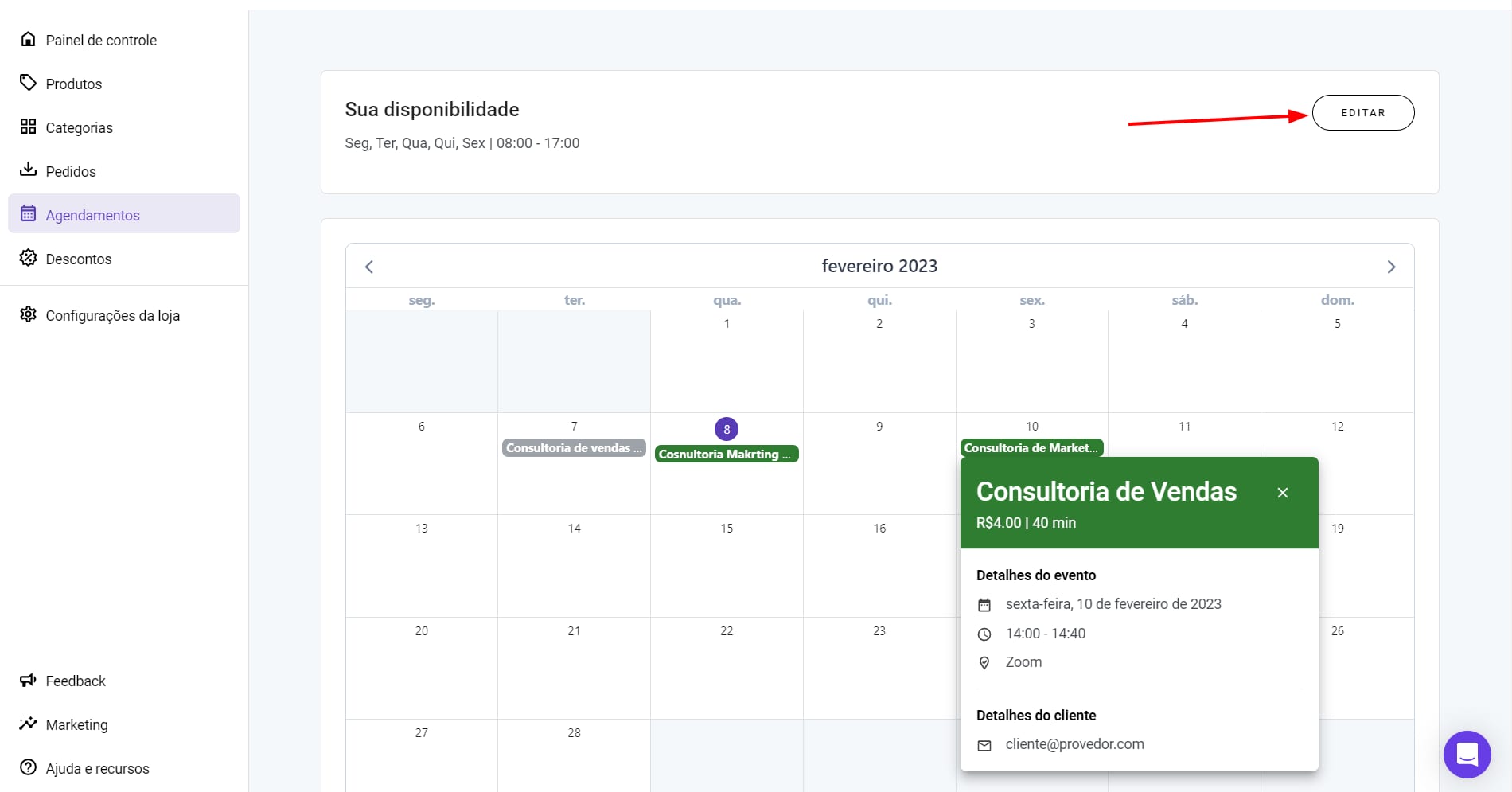No calendário abaixo da sua disponibilidade, você verá todos os horários agendados.