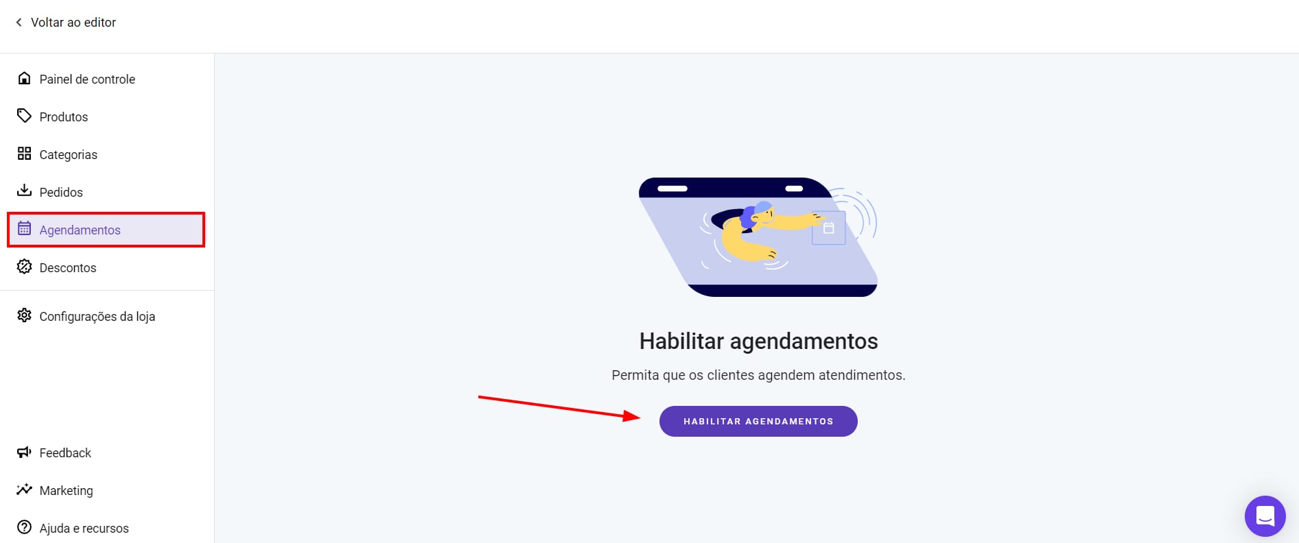 Na sua área de gerenciamento de loja, vá até Agendamentos, e clique em Habilitar agendamentos: