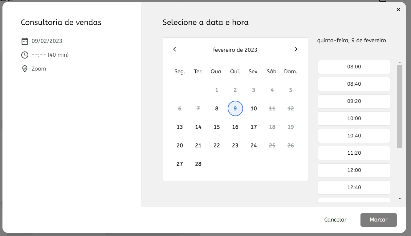 Por exemplo, se você vendeu 30 minutos de consultorias online e seu horário de funcionamento é de 9h às 17h, o cliente poderá escolher os seguintes horários: