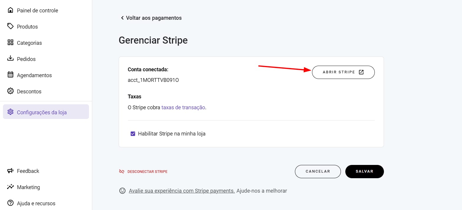 Outra forma de acessá-lo é através do endereço dashboard.stripe.com ou da sua área de gerenciamento da loja → Configurações da loja → Pagamentos→ Gerenciar (Stripe) → Abrir Stripe: