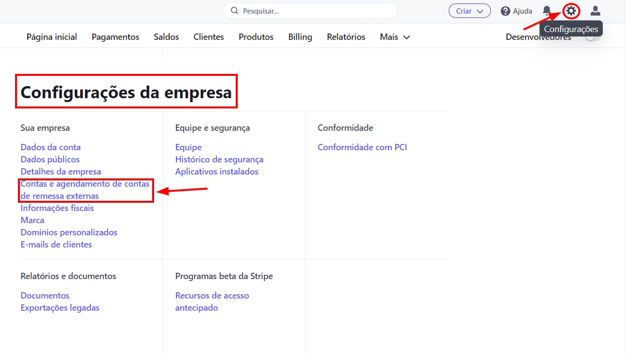 Caso você tenha pulado a etapa de inserir suas informações bancárias ao configurar a Stripe ou queira atualizá-las, basta acessar Configurações → Configurações da empresa → Contas e agendamento de contas de remessa externas:
