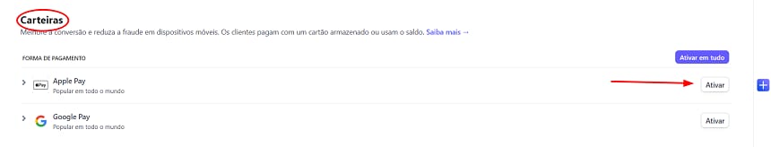 Role para baixo até a seção Carteiras e clique em Ativar próximo à Apple Pay: