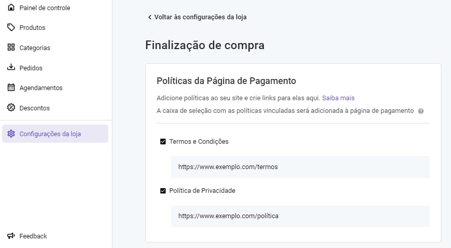 Nas Configurações da loja → Finalização de compra, você verá as seguintes seções: