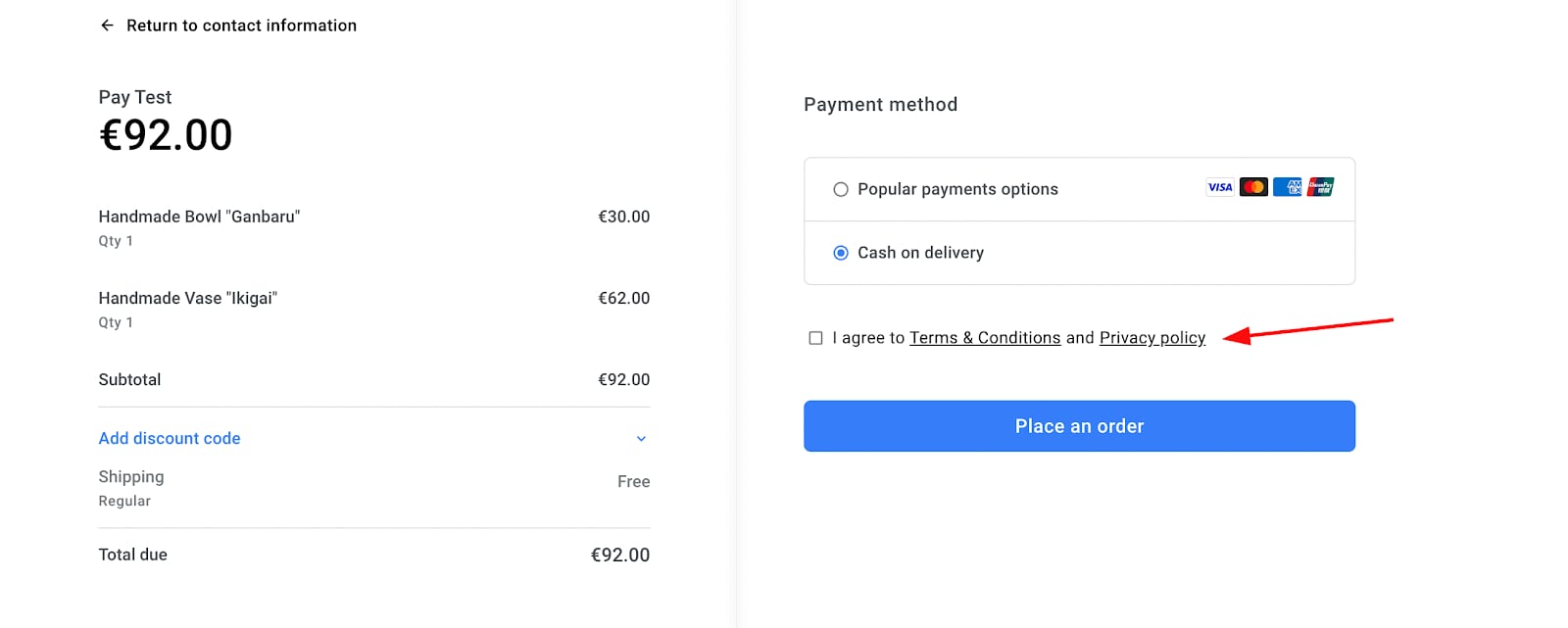 Dessa forma, seu cliente será solicitado a concordar com as políticas da sua empresa antes de concluir o pagamento na finalização da compra: