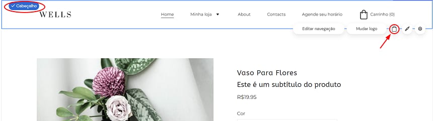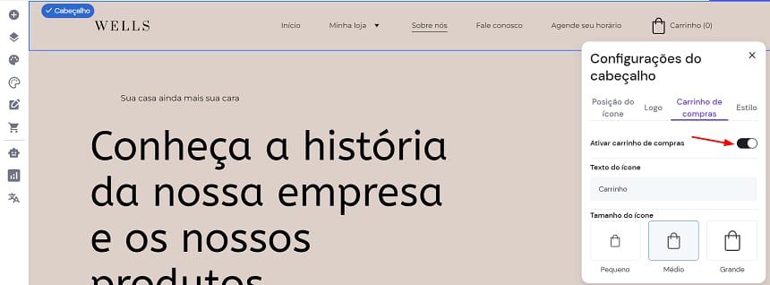 Depois de ativar os recursos de loja virtual no seu site, você poderá ativar ou desativar o carrinho de compras com muita facilidade, basta acessar as configurações do cabeçalho.