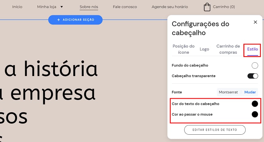 Nas configurações do Carrinho de compras, é possível também alterar o texto e o tamanho do ícone. Para alterar a cor do carrinho de compras, basta abrir a aba Estilo e alterar a cor do texto do cabeçalho: