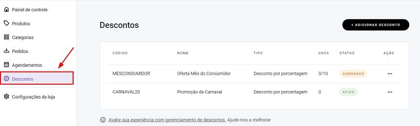 Na área de gerenciamento da sua loja, vá até Descontos, e clique em Adicionar desconto