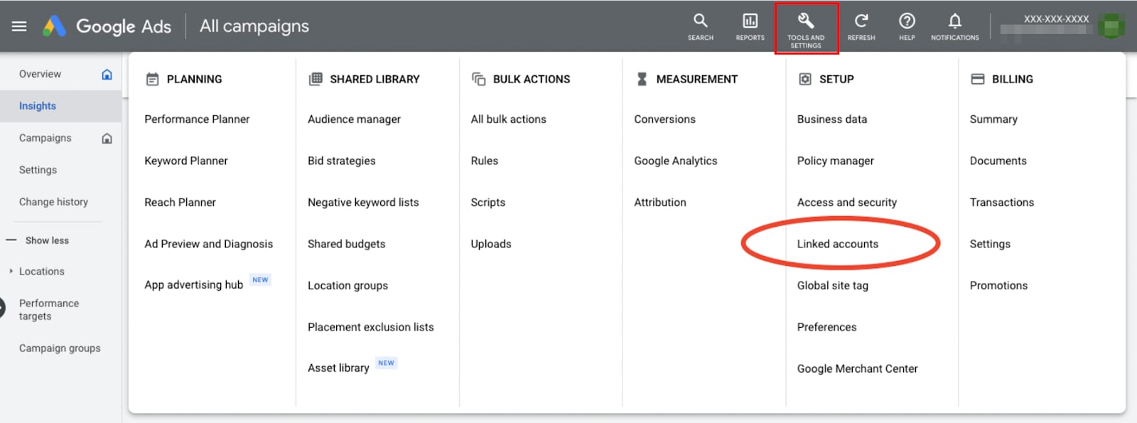 1. Acesse a sua conta do Google Ads. Clique em Ferramentas e configurações (Tools and settings) na parte superior direita e selecione Contas vinculadas (Linked accounts):