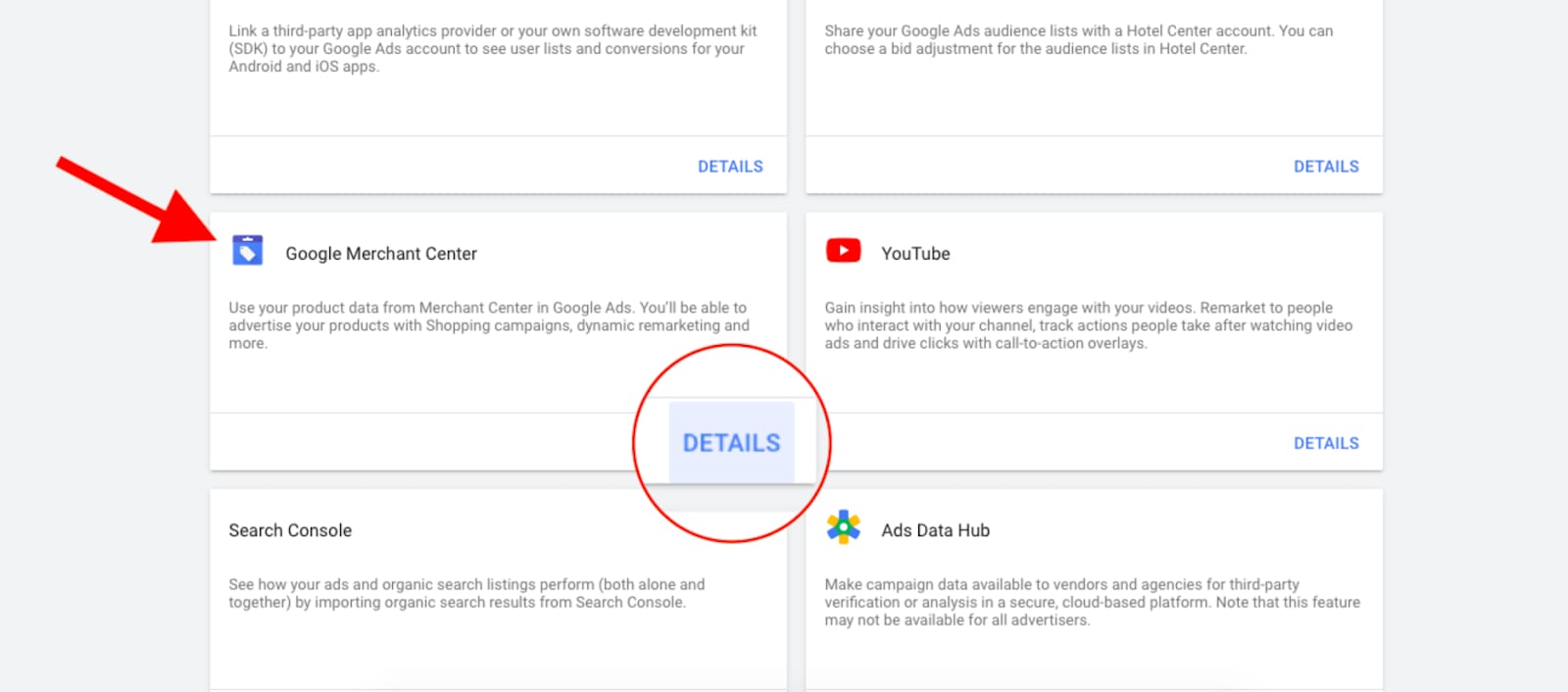 2. Em Suas contas e produtos vinculados (Your linked accounts and products), procure Google Merchant Center, depois clique em Detalhes (Details):