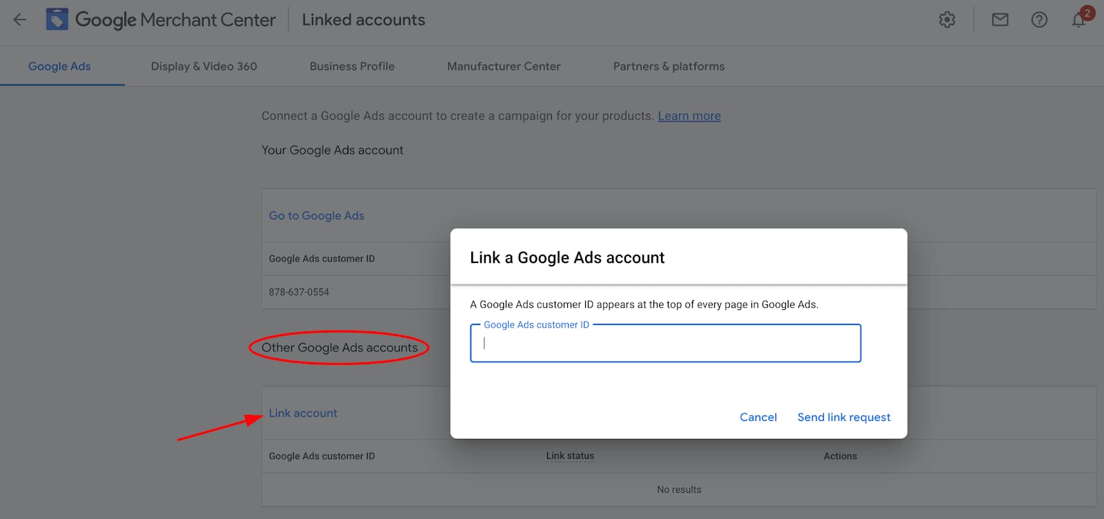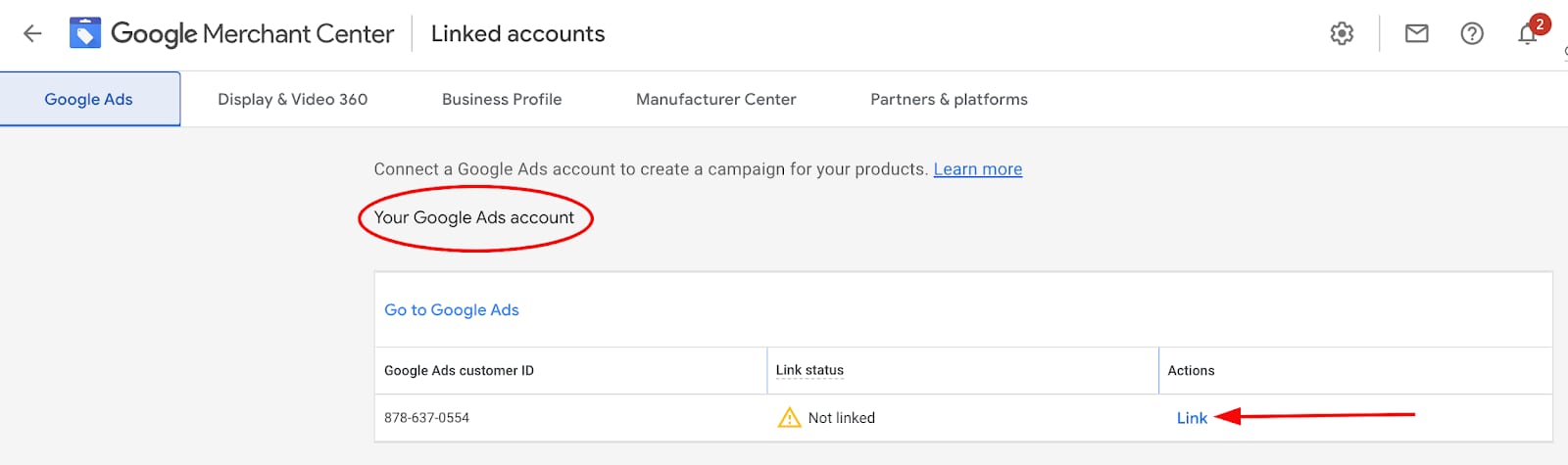 Solicitar a vinculação do Google Ads no Merchant Center