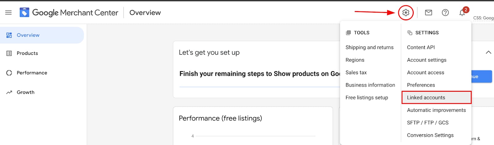 1. Na sua conta do Merchant Center, clique no ícone de configurações e na página de configurações clique em Contas vinculadas (Linked accounts):