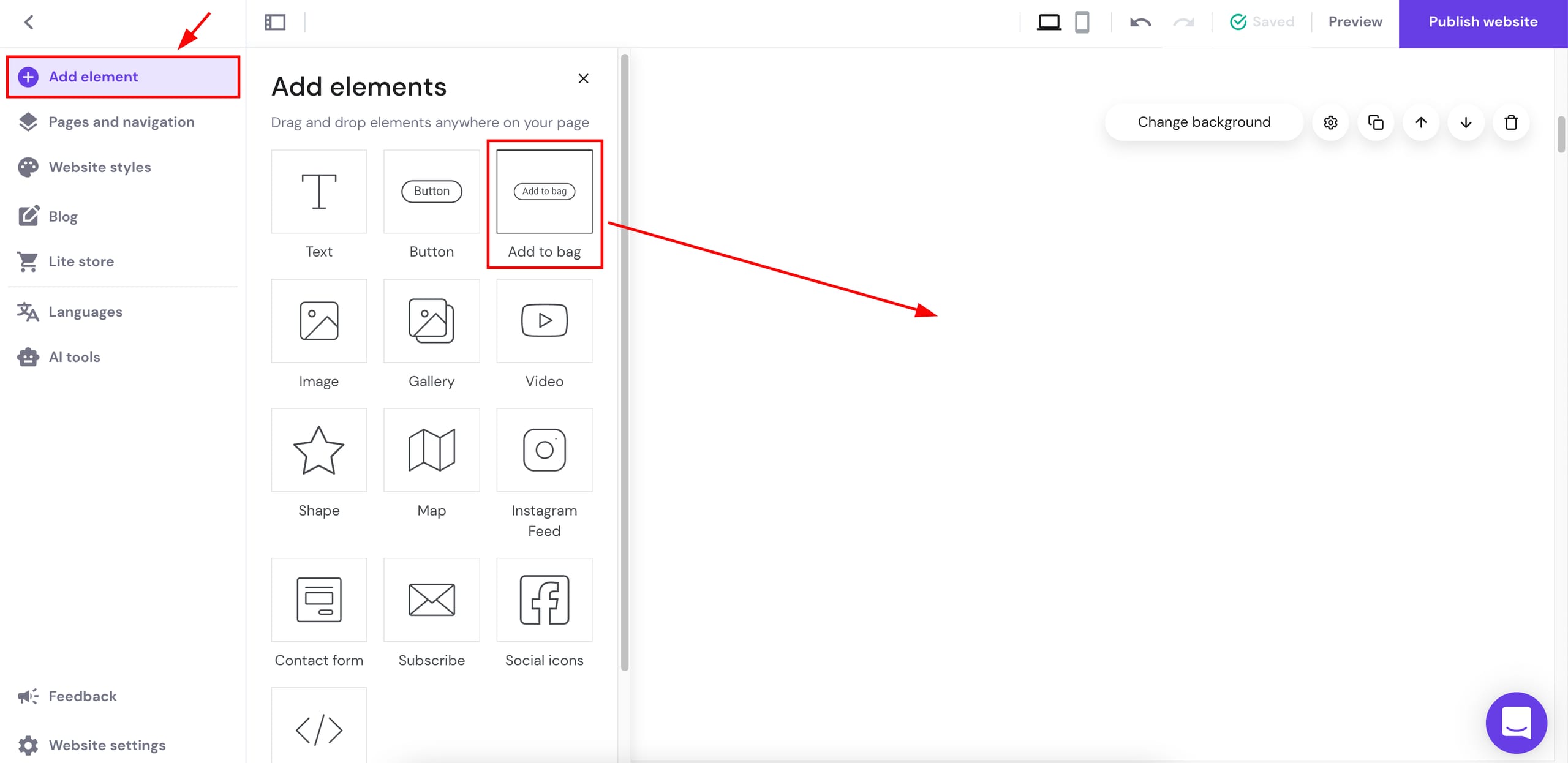 Expanda o painel Adicionar elementos à esquerda, localize o botão Adicionar a sacola e arraste e solte-o em qualquer lugar da página: