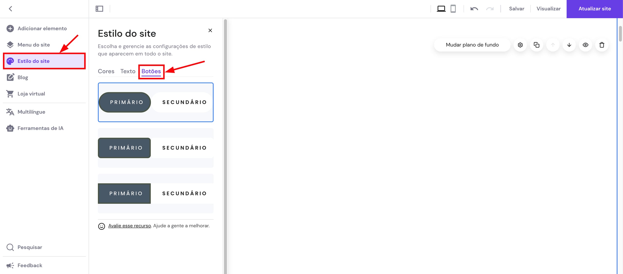 No menu lateral esquerdo, clique em Estilo do site e selecione a aba Botões. Escolha o formato desejado: