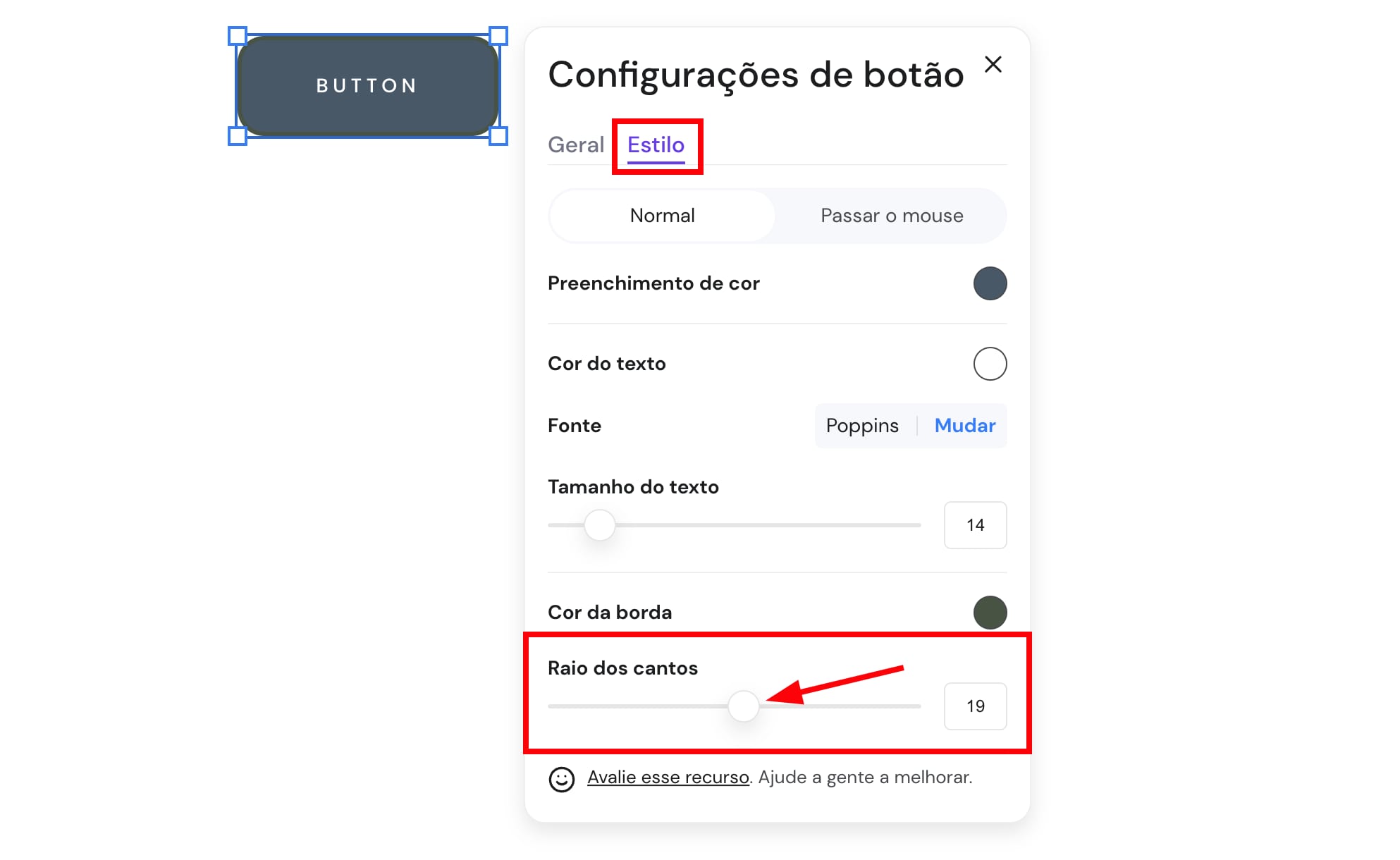 Dentro do editor de sites, clique no botão que você deseja alterar. Selecione Editar botão. Na janela que será aberta, clique na aba Estilo e mude o raio da borda do botão: