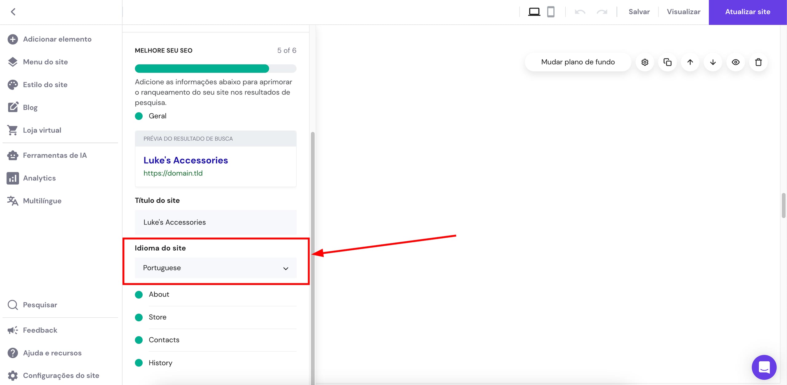 Para adicionar o atributo lang ao seu site, vá até as Configurações de SEO e selecione o idioma desejado: