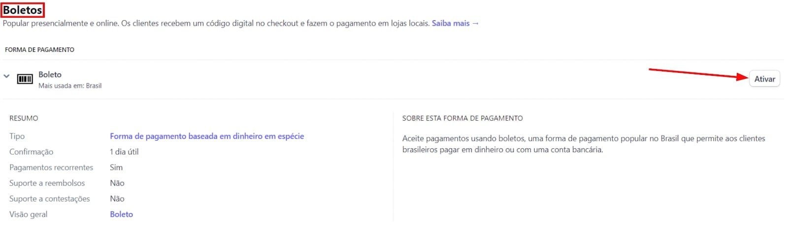 3. Role para baixo até a seção Boletos, e clique Ativar: