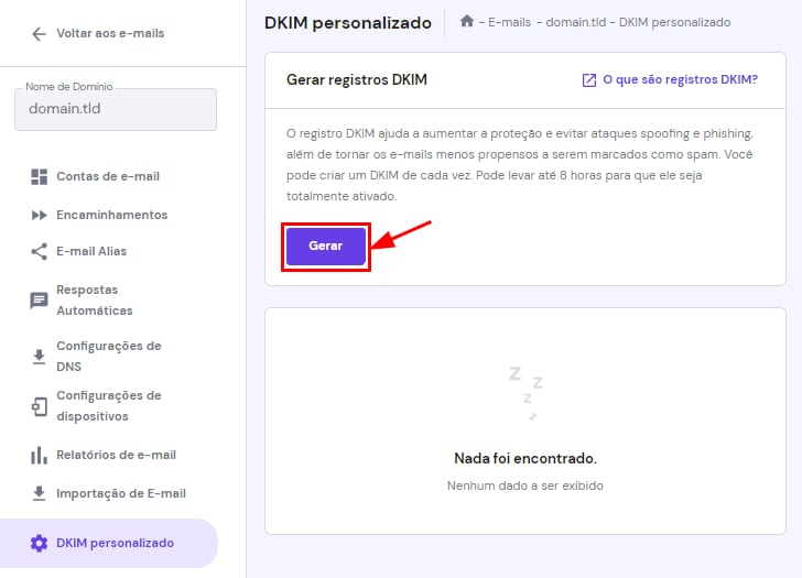 Para criar um registro personalizado, vá na aba Emails de seu painel, escolha o domínio e selecione DKIM personalizado na barra à esquerda. Depois, clique em Gerar: