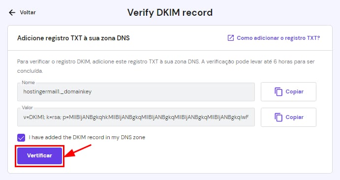 Quando ele estiver propagando, você pode verificar se os registros foram adicionados corretamente na seção DKIM personalizado no seu painel, selecionando a caixa e clicando em Verificar: