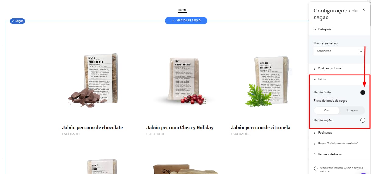 Clique na seção do produto, selecione Editar seção e altere a cor na guia Estilo:
