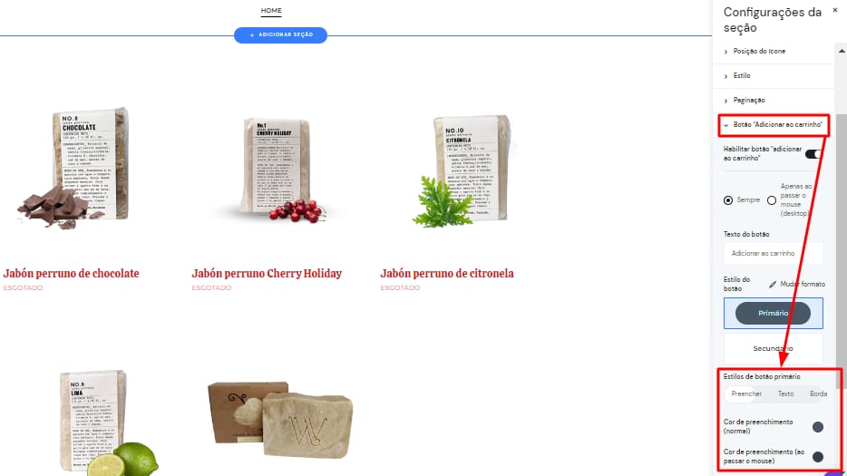 Clique na seção da lista de produtos, selecione Editar seção e altere a cor do botão na guia do Botão “Adicionar ao carrinho”: