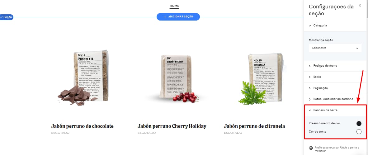 Clique na seção da lista de produtos, selecione Editar seção e altere a cor da barra na guia Banners de barra: