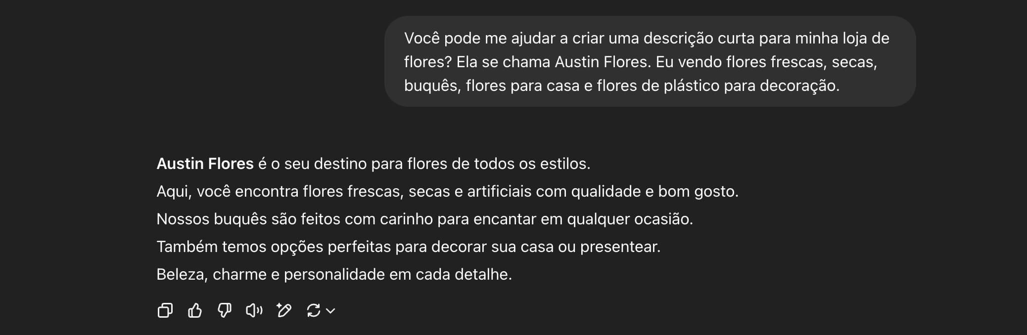 Descreva seu negócio ou sua marca em poucas frases. Nossa IA usará isso para gerar conteúdo original adaptado especificamente para você. Quanto mais detalhes você der, melhores serão os resultados! Se tiver dificuldade para criar uma descrição curta, você também pode usar o ChatGPT: