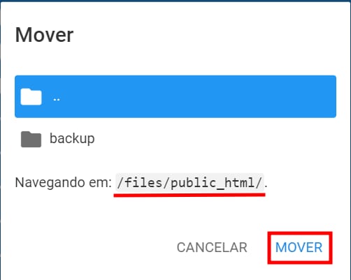 Clique duas vezes na pasta com (..) até chegar ao diretório principal, de modo que o destino seja /files/public_html. Então, clique em Mover: