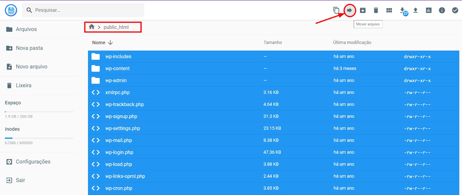 Agora, vamos mover os arquivos do seu site para a pasta correta. Para isso, abra a pasta com os arquivos extraídos do site (no nosso caso, ela se chama backups) → domínios → selecione o domínio desejado→ abra a pasta public_html, selecione todos os arquivos e clique em Mover arquivo no canto superior direito: