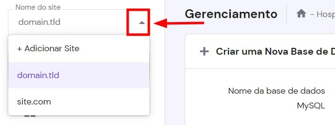 Certifique-se de selecionar o site correto (o que você deseja fazer o upload do banco de dados) no menu suspenso esquerdo:
