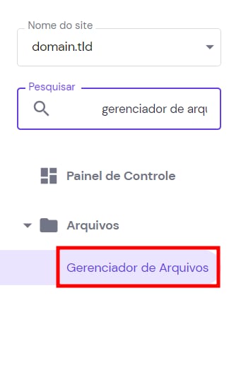 No hPanel, acesse Sites e clique em Gerenciar ao lado do site desejado. Depois, digite Gerenciador de arquivo na barra lateral esquerda e clique na opção que aparecer: