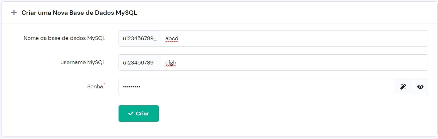 A primeira parte do nome do banco de dados e do nome de usuário (u123456789) é única e não pode ser removida ou alterada 📌